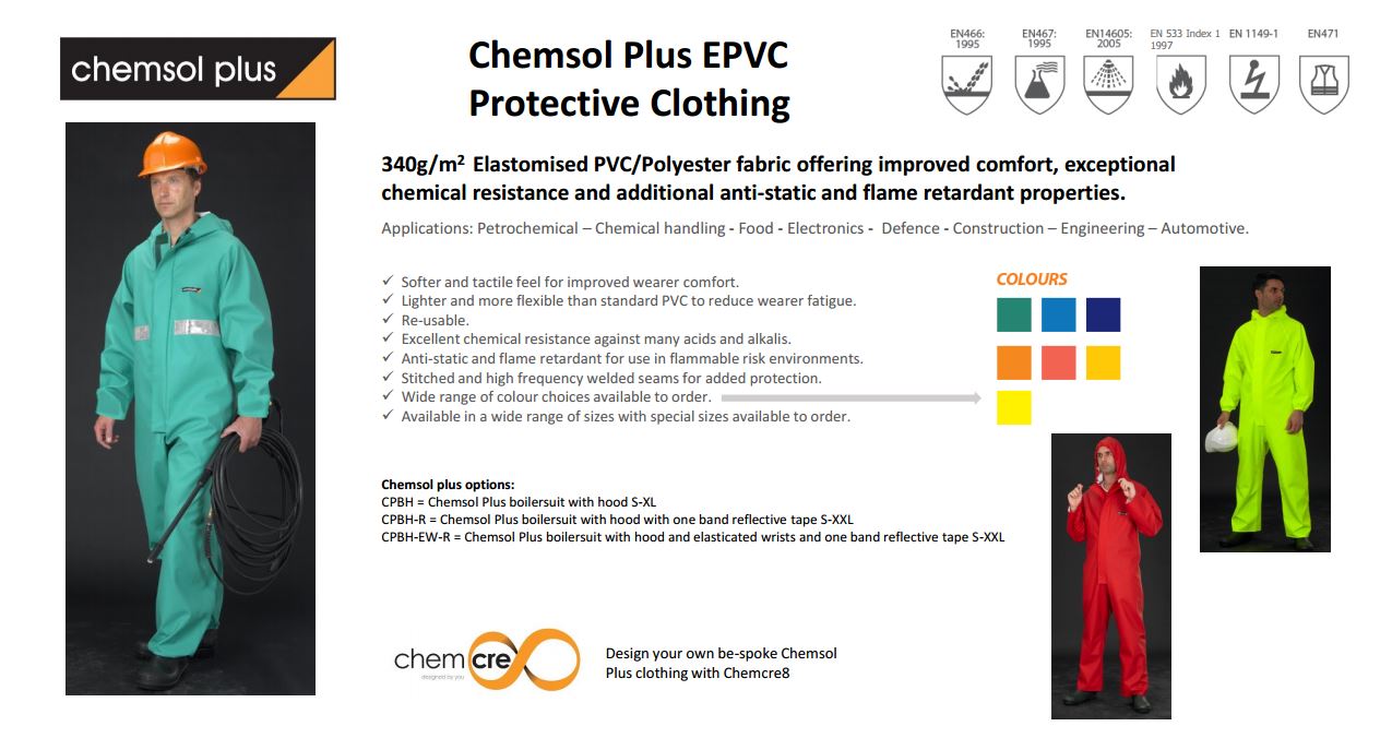 Chemsol Plus garments are manufactured from a softer, more tactile 340g/m² EPVC/Polyester fabric with additional anti-static and flame retardant properties needed for many higher risk applications.