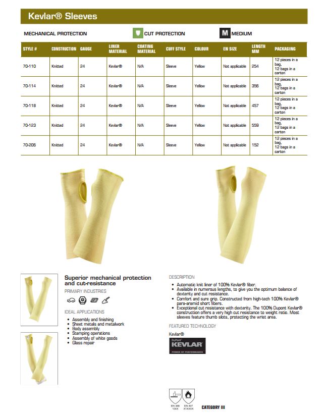 Ansell 70-114 Kevlar Cut Protection Sleeves conforms to: BS EN 388:2003 1.3.4.X and EN 407:2004 X1XXXX