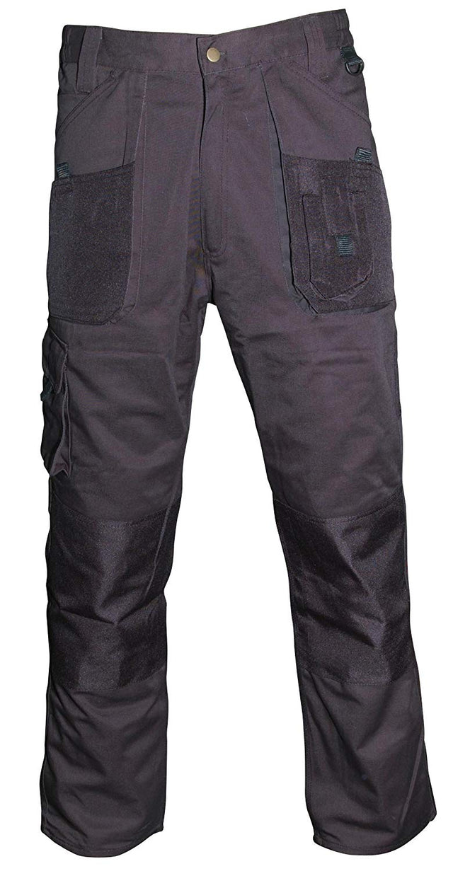Features include an elasticated waist for extra comfort, Velcro belt loops, multiple pockets, and knee pad pockets.