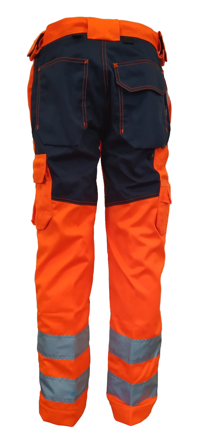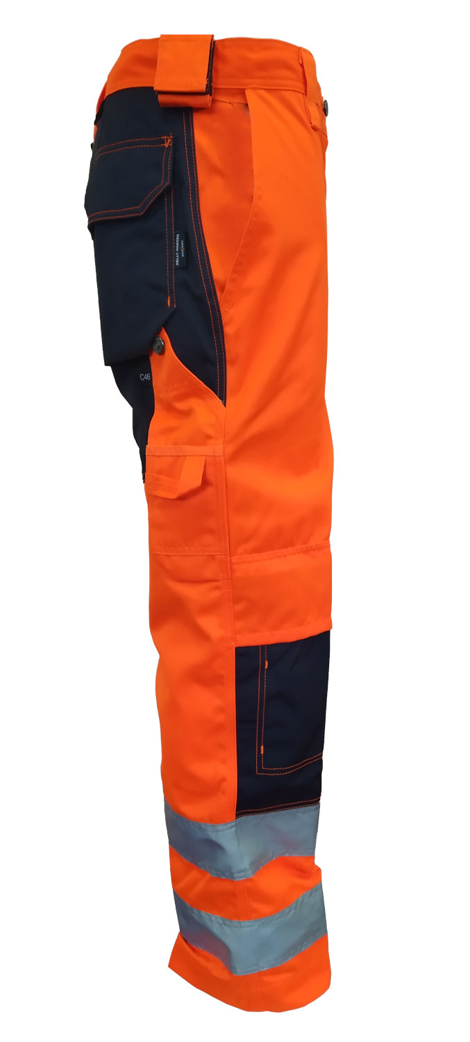 Professional work trousers in comfortable and durable polycotton blend. Bright orange colour and reflective bands provide high visibility, and navy colour details in areas most subject to soiling.