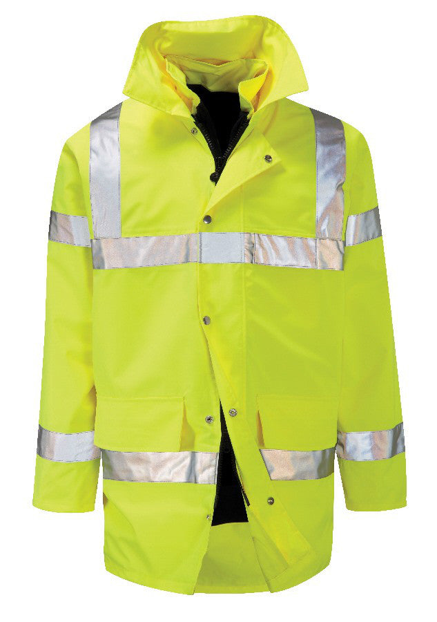 Orbit Bedivere Hi Vis Traffic outer jacket conforms to EN471 Class 3 and EN343 Class 3:1 safety standards.