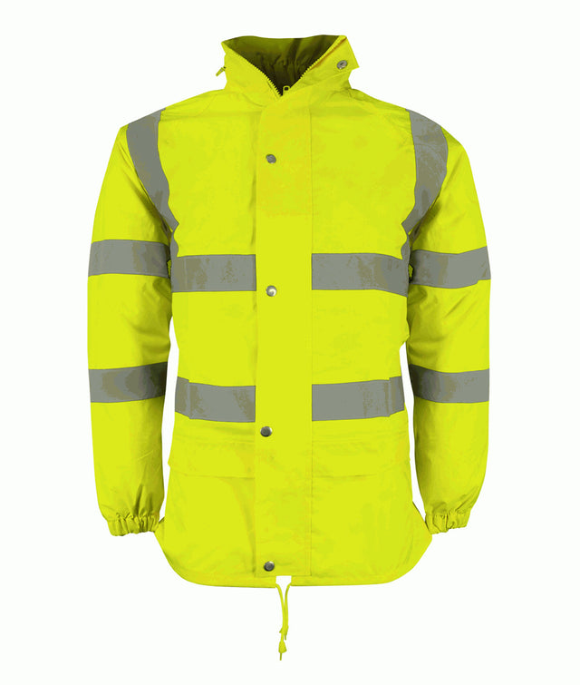 Hi-Vis light weight jacket with a plastic open end zip and studded storm flap.