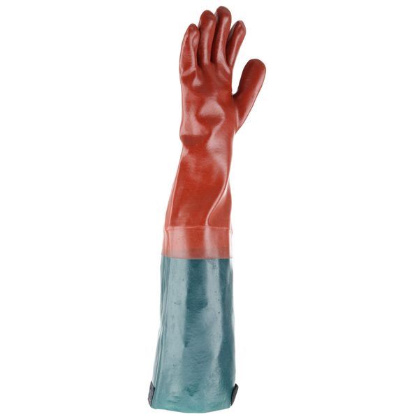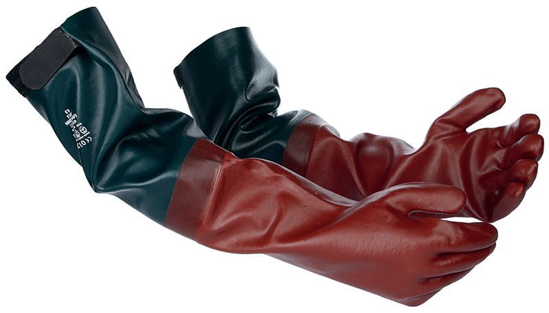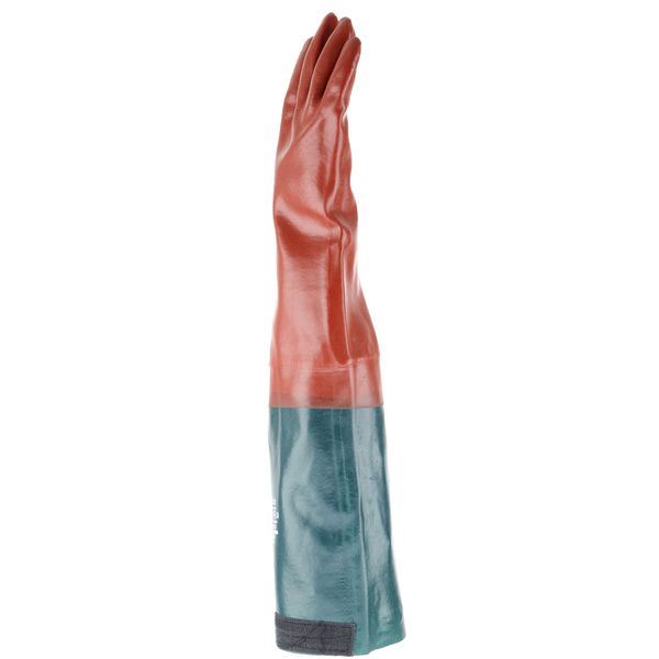 This PVC gauntlet protects against acids and alkalis, and is EN388 safety compliant score for abrasion resistance.