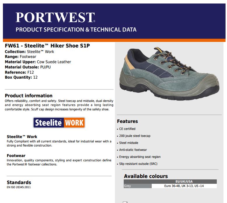 Portwest Steelite FW61 Hiker Safety Shoe conforms: EN ISO 20345 - S1P, SRA safety footwear standards.