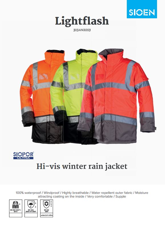 Sioen Lightflash 313A Winter Rain Jacket conforms to: EN471 3:2 and EN343 3:3 safety standards.