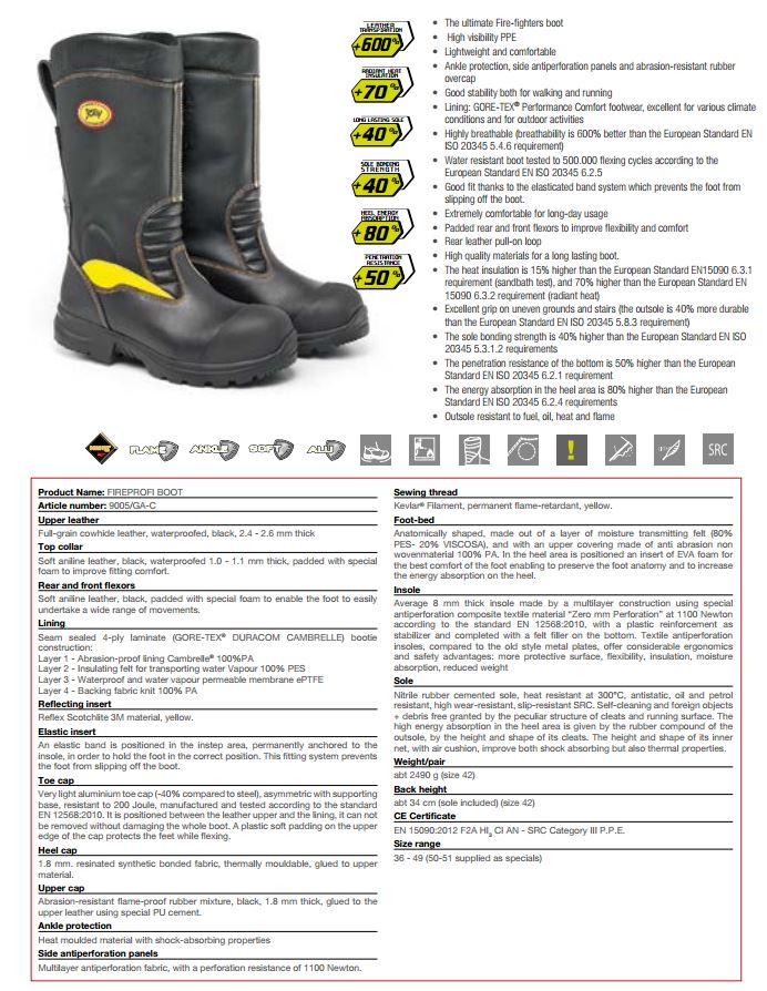 Firefighter boots are made using full grain leather with water-repellent treatement - rubber toecap cover - rear gusset - innovative elastic system for perfect fit - rear pull-on loop - ankle protection.