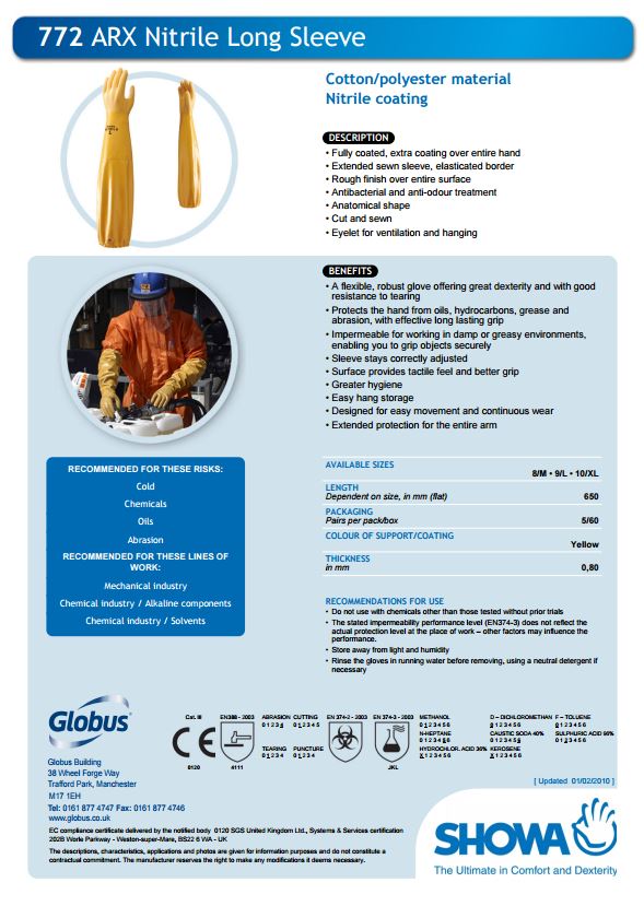 Showa 772 Arx Nitrile Coated Long Sleeve Chemical Resistant Glove complies to EN420 Cat.3 EN388:2003 4.1.1.1. EN374:2003- 2-3 safety standards.