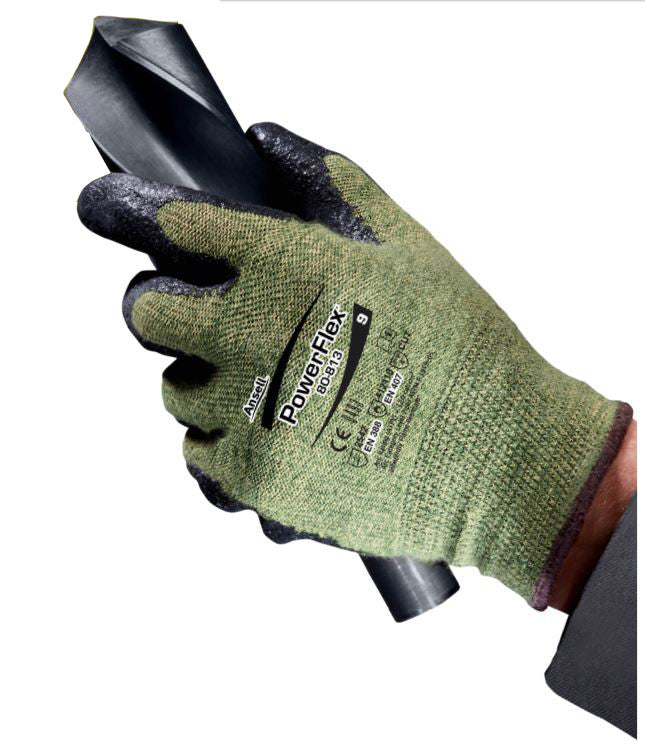 Ansell 80-813 PowerFlex Cut and Flame Resistant Work Glove conforms to: EN 388 2.5.4.2. EN 407 41211X safety standards.