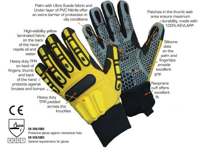 Impacto Dryrigger oil & Water Resistant Glove help prevent hairline fractures, injuries, bruising and pinched fingers.