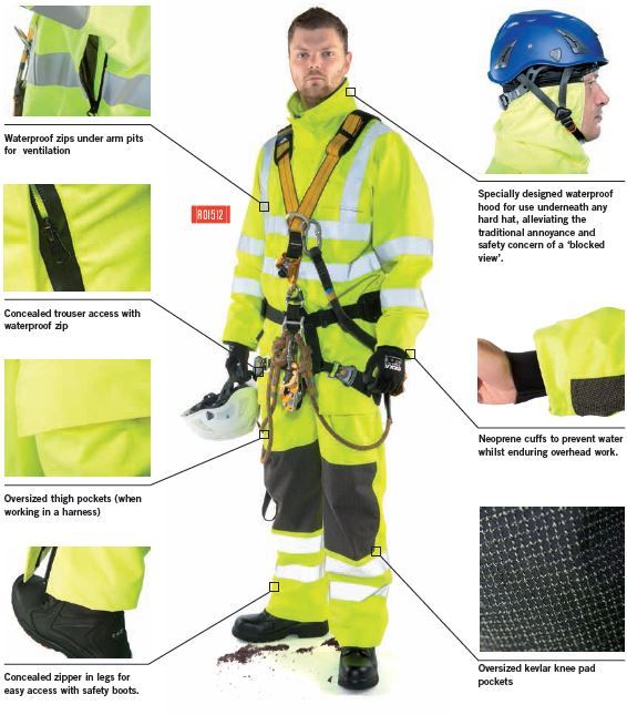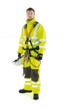These yellow full option coveralls, with the secret pockets and kevlar coated knees for longer life, are used typically by overhead linesmen, or maintenance crews on overhead pylons, mobile phone masts and windfarms.