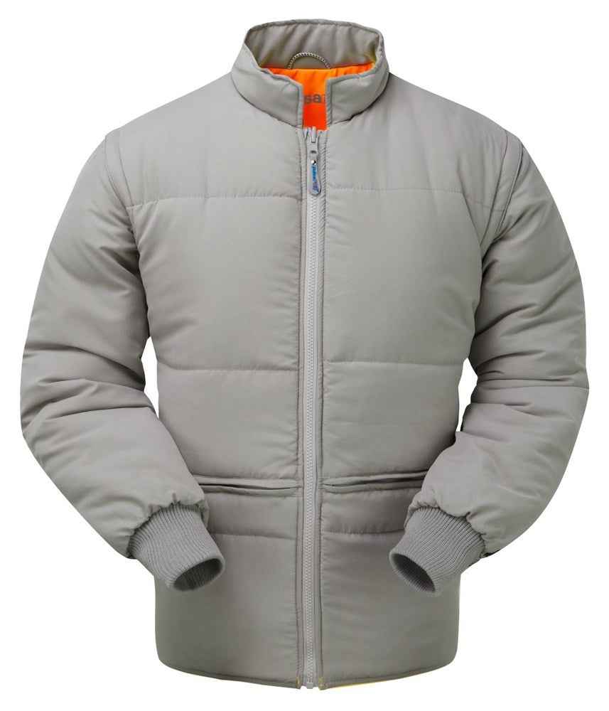 Zip off detachable sleeves with knitted cotton cuffs.