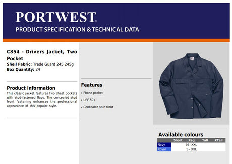 Portwest 2 Pockets Drivers Jacket C854 Polycotton Navy