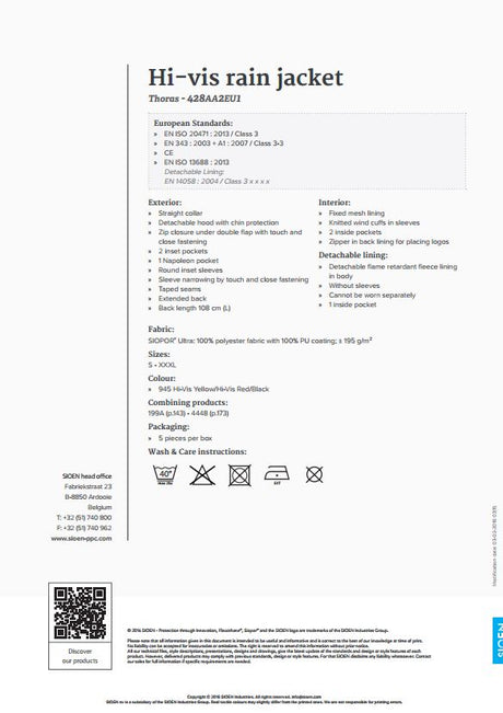Sioen Thoras 428A Waterproof Hi Vis Detachable Lining Quilted Winter Rain Parka Jacket