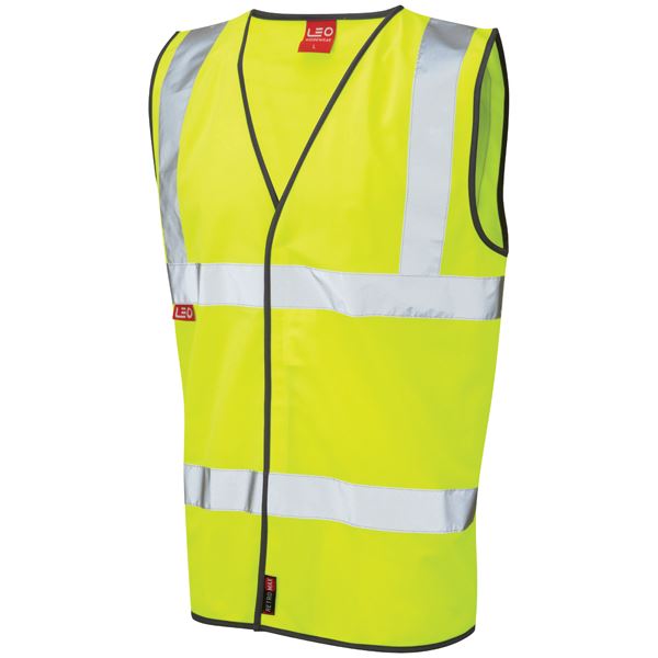 Leo Workwear Dolton W06-Y Hi Vis Waistcoat conforms to: EN 20471 Class 2,2 (Hi Vis) & EN 533, index 1 (FR) safety standards.
