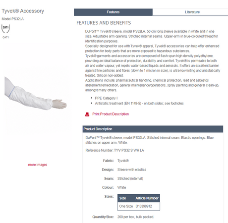 Dupont Tyvek Ps32La Armlets Oversleeves Single Sleeve