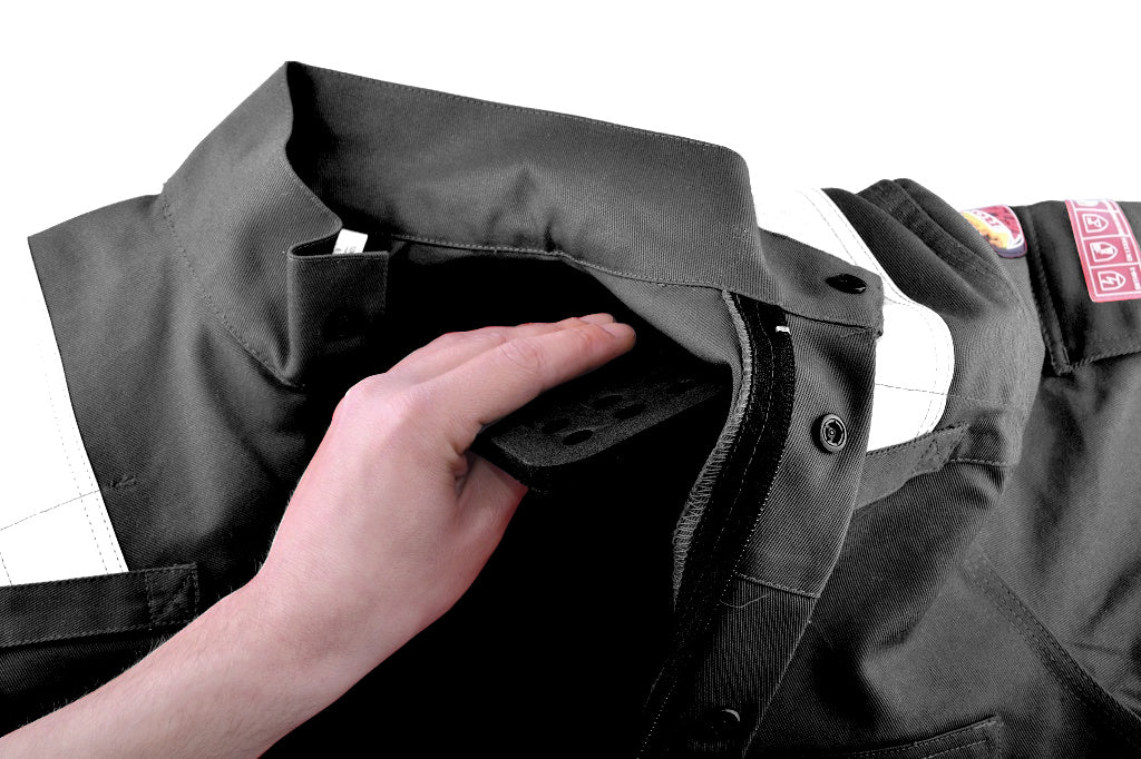 In order to increase comfort have been removed the shoulder seams and added a new shoulder construction that allows to wear shoulder pads.