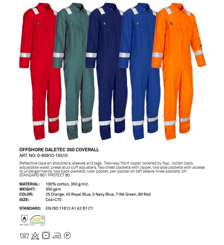 Wenaas 80920-15511 Daletec Offshore Coverall conforms to: EN 1149-5, EN 61482-1-2 cl. 1 safety standards.