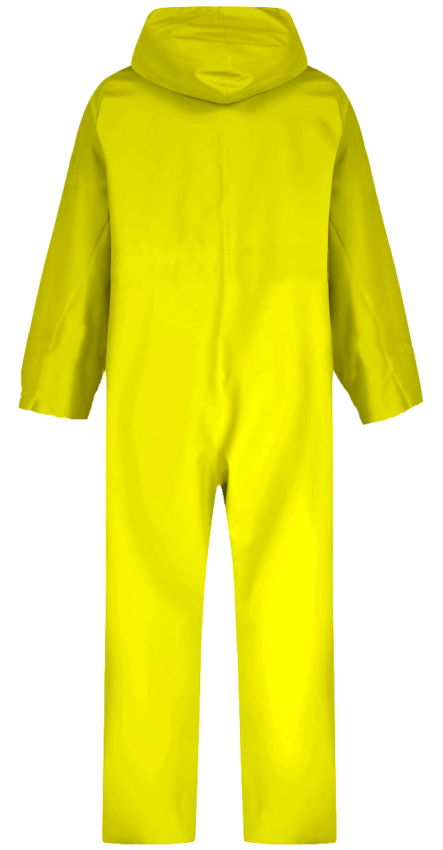 Re-usable high tear and abrasion resistant coverall made from a material blend of PVC/PU offering long-lasting chemical protection and resistance to animal fat and food oils..