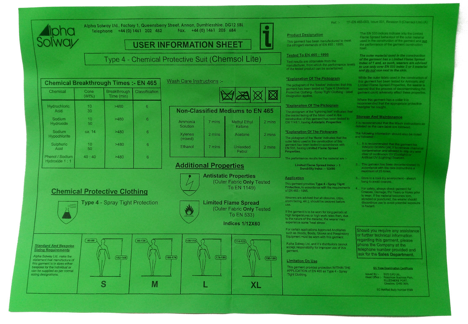 Alpha Solway CLBH Chemsol Lite Coverall conforms to: BS EN 465:1995 Type 4; EN 1149-1:1996; BS EN 533 Index 1 standards.