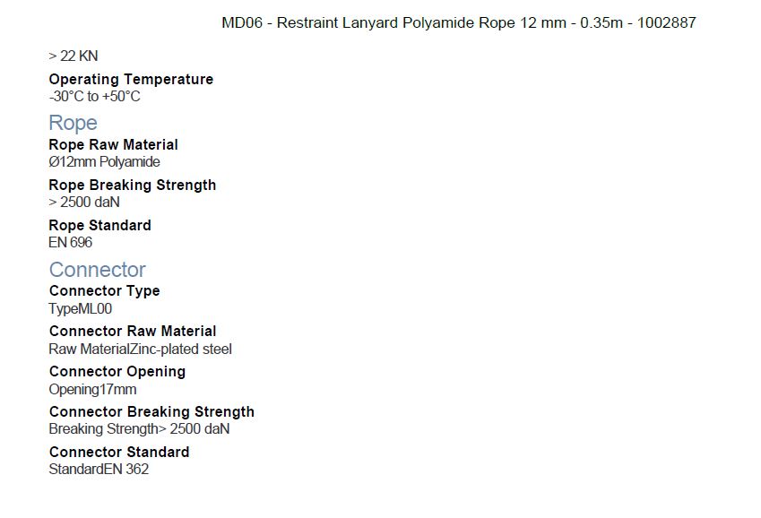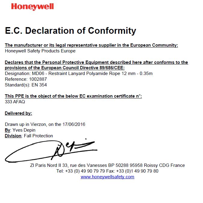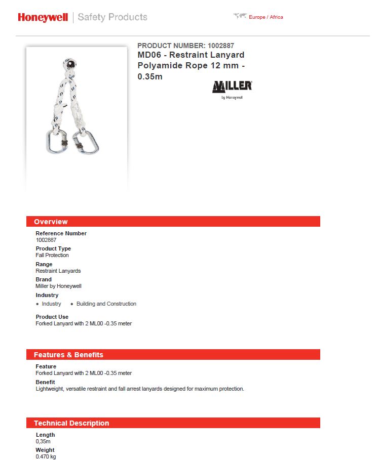 Honeywell Miller MD06 Forked Lanyard conforms to: EN 354; Rope Standard EN 696; Connector Standard EN 362.