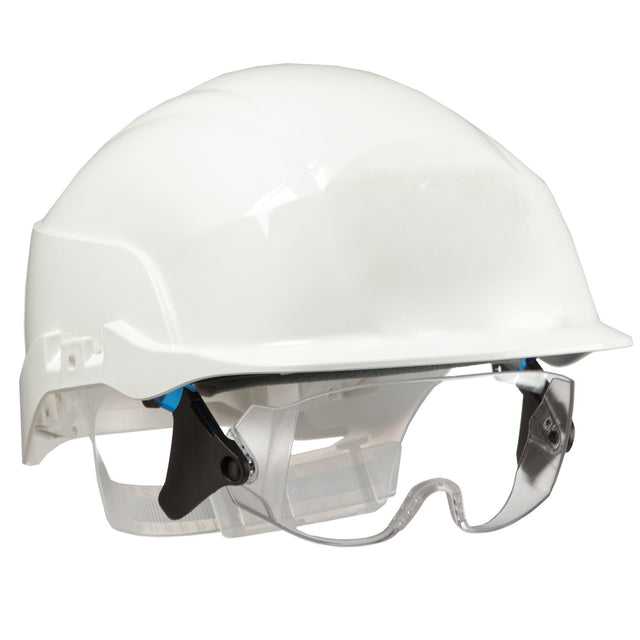 Fully certified safety hard hat with integrated over spectacles to deliver grade B medium energy EN 166 impact protection.