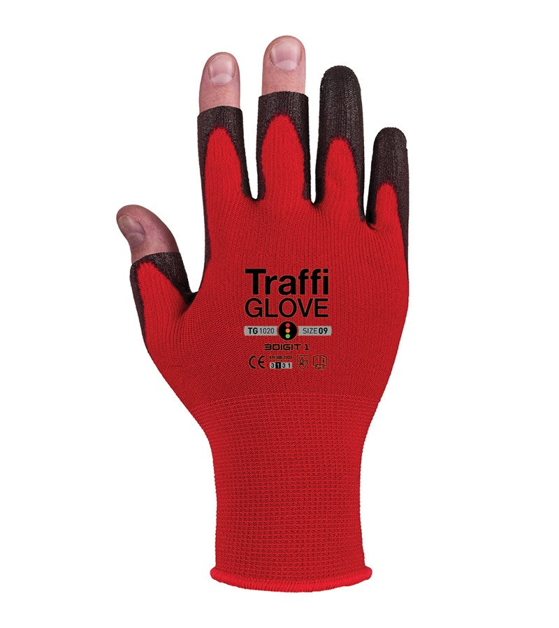 Traffiglove TG1020 3 DIGIT Safety Gloves PU Coating 3 Exposed Fingertips - Red / 8 is backordered and will ship as soon as it is back in stock.