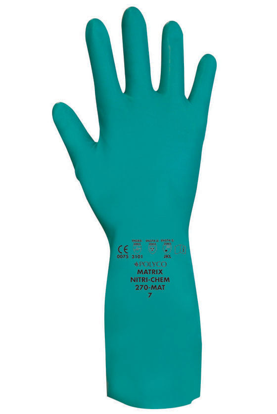 Polyco Matrix 27-MAT Nitri-Chem Safety Glove conforms to: EN374-1, EN374-2, EN374-3, EN388 3.1.0.1. EN420:2003 standards.
