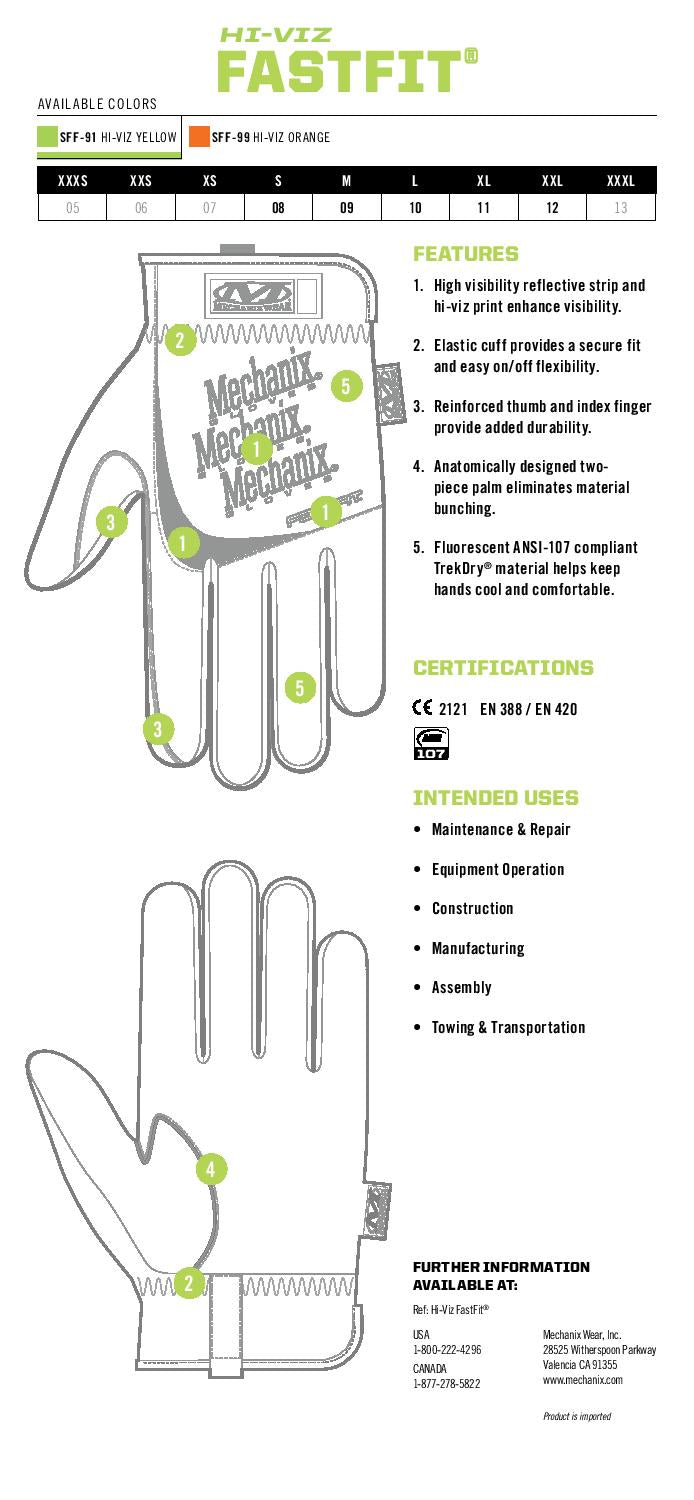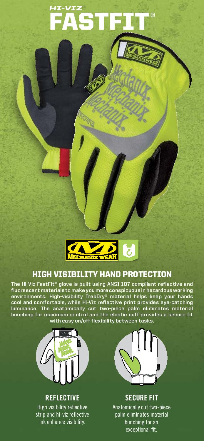 Mechanix Wear SFF-91-010 fast fit green large gloves have a high visibility reflective strip and hi-viz print enhance visibility.