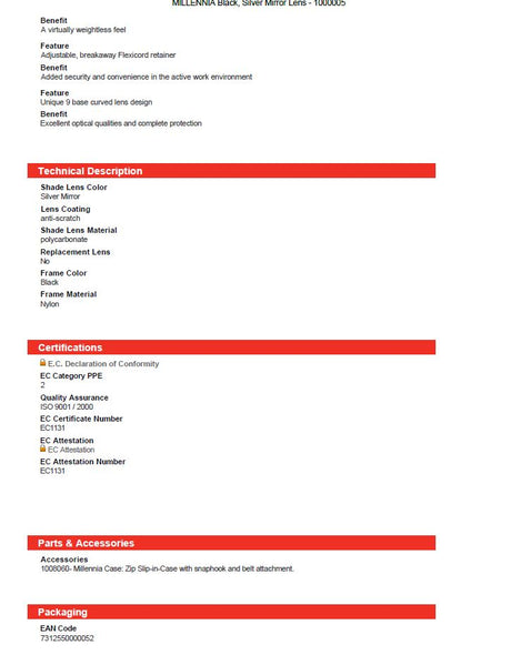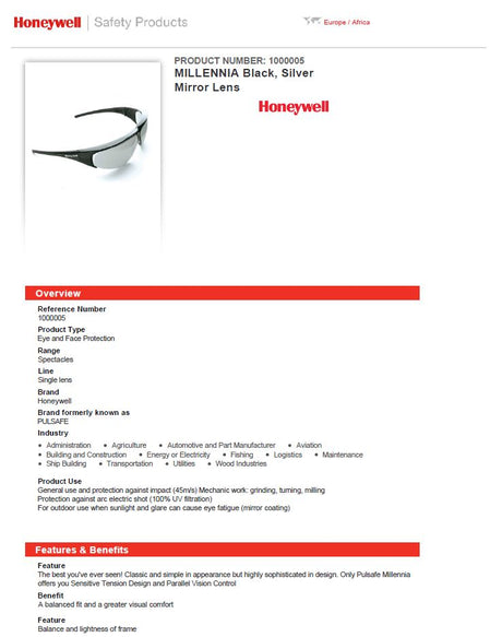 Honeywell 1015689 Protege Black Frame Spectacle Silver Mirror Lens